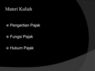 Dokumen tersebut membahas tentang materi kuliah perpajakan yang mencakup pengertian pajak, fungsi pajak, dan hukum pajak. Pajak didefinisikan sebagai kontribusi wajib kepada negara yang bersifat memaksa berdasarkan undang-undang untuk kemakmuran rakyat. Fungsi pajak yaitu sebagai sumber pendanaan negara dan alat pengaturan kebijakan. Hukum pajak mengatur hubungan antara p