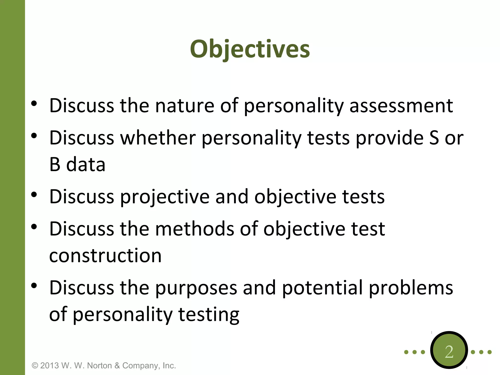 This document summarizes a chapter about personality assessment and testing. It discusses the nature of personality assessment, different types of personality tests including projective tests and objective tests, and methods used to construct objective personality tests. It also covers the purposes of personality testing and potential problems, such as whether tests are unfair or describe people by scores in an undignified way. Personality tests are frequently used by researchers, clinicians, and corporations to assess traits, motives, and how people perceive the world. Both projective tests that provide behavioral data and objective tests that provide self-report data are discussed.
