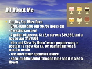 The document appears to be an autobiography project written by a student named Perrin McKissick. It includes sections about details of their birth, childhood memories like not being able to swim or spell their name, favorite music and movies from when they were younger, what a typical school day is like for them, hobbies like swimming and tennis, and things they wish they could do like meet famous singers. Photos and personal details are included to describe themselves and their interests.