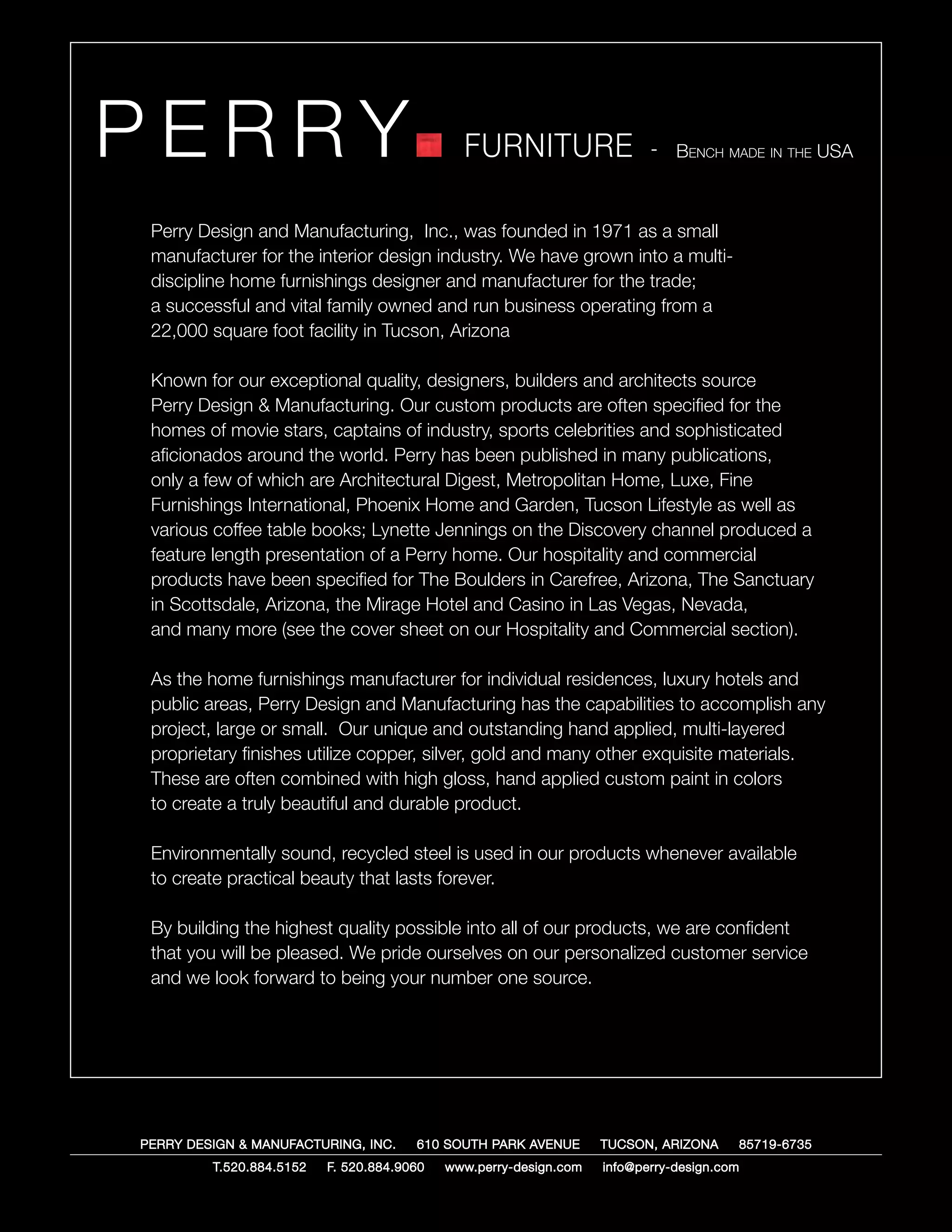 Perry Design and Manufacturing is a furniture company founded in 1971 in Tucson, Arizona that designs and manufactures custom high-end furniture. They are known for their exceptional quality and durable finishes. Their products are often specified for luxury homes and commercial spaces. They pride themselves on their personalized customer service and high quality craftsmanship.