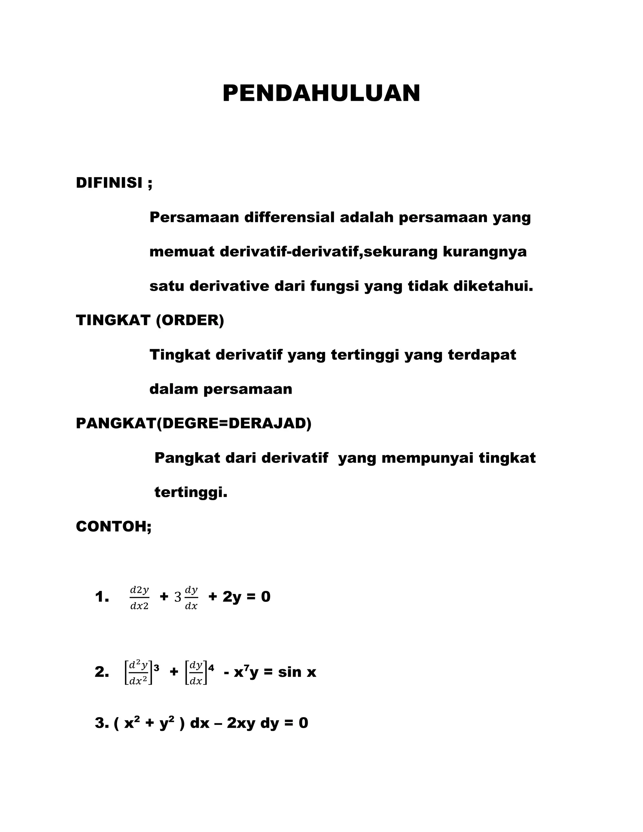 Dokumen tersebut membahas tentang pengertian dan cara penyelesaian persamaan diferensial tingkat satu dan pangkat satu. Persamaan diferensial adalah persamaan yang memuat derivatif dari suatu fungsi. Terdapat beberapa jenis persamaan diferensial seperti persamaan homogen, tidak homogen, eksak dan tidak eksak yang diselesaikan dengan beberapa metode seperti faktor integral, variasi konstan, dan metode Bernouli.