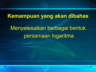 Dokumen ini membahas tentang penyelesaian berbagai bentuk persamaan logaritma dan cara mengubahnya menjadi bentuk kuadrat. Beberapa contoh soal dan solusi disertakan untuk menunjukkan langkah-langkah dalam menyelesaikan persamaan logaritma. Selain itu, terdapat penjelasan mengenai kondisi yang diperlukan untuk menyelesaikan persamaan logaritma.