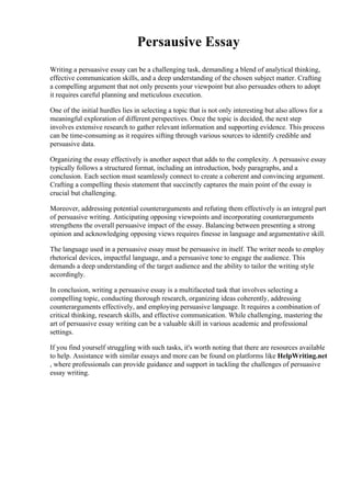 Writing a persuasive essay is a complex task that requires analytical thinking, research skills, and effective communication. It involves selecting an interesting topic, conducting thorough research to find supporting evidence, and organizing the essay with an introduction, body paragraphs, and a conclusion. Additionally, persuasive essays must address counterarguments, use persuasive language tailored to the audience, and present a compelling thesis statement. Mastering this art can be difficult but provides a valuable skill for various academic and professional contexts. Help is available from resources that provide guidance, support, and assistance with persuasive writing challenges.