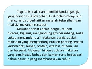 Dokumen ini membahas tentang pentingnya nutrisi dalam makanan yang dikonsumsi oleh manusia dan hewan, serta peran zat gizi seperti karbohidrat, protein, dan lemak dalam berbagai fungsi tubuh. Nutrisi dibagi menjadi makro dan mikro, dengan masing-masing memiliki peran seperti penghasil energi, pembangun jaringan, dan pengatur proses metabolisme. Kesadaran akan kebersihan dan nilai gizi makanan sangat penting untuk menjaga kesehatan dan keseimbangan zat dalam tubuh.