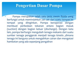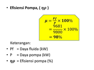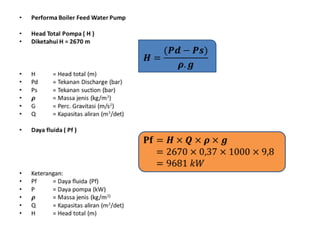 Dokumen ini membahas analisis efisiensi pompa boiler feedwater pump turbin (BFPT) di PLTU Suralaya, mencakup klasifikasi pompa, komponen utama, serta spesifikasi teknis pompa. Penekanan diberikan pada pentingnya operasi normal BFPT untuk suplai air ke boiler agar sistem dapat berfungsi secara optimal. Data historis tekanan isap dan tekanan buang sebelum overhaul pada Mei 2013 turut disajikan untuk menganalisis performa pompa.