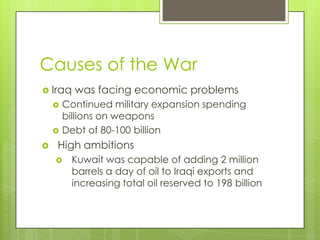 The Persian Gulf War began in August 1990 when Iraq invaded Kuwait, claiming Kuwait was stealing Iraqi oil and territory. Iraq's leader Saddam Hussein expected the US and Saudi Arabia would not intervene. However, the US led a coalition of forces to defend Saudi Arabia and liberate Kuwait under Operation Desert Shield. In January 1991, the US-led coalition launched a massive air campaign called Operation Desert Storm targeting Iraqi forces and infrastructure. After weeks of aerial bombardment and missile attacks, a short ground invasion by US-led forces in February 1991 crushed the Iraqi army and liberated Kuwait within 100 hours, with minimal allied casualties. The war re-established US credibility and intervention in the region.