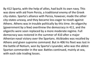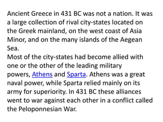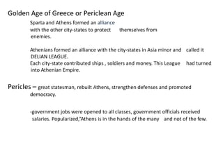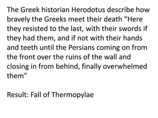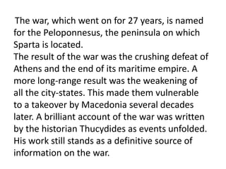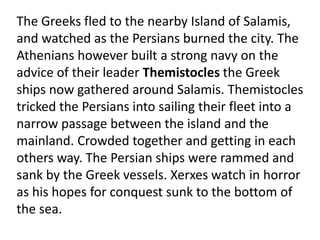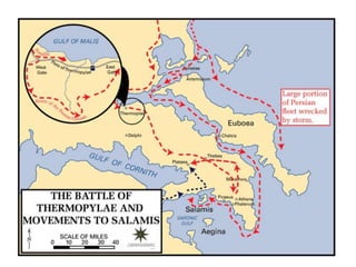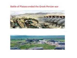 The Persian War document summarizes the key conflicts between Greece and Persia in the 5th century BC. It describes how the Persians first invaded Greece in 490 BC in response to Athens supporting a rebellion in Asia Minor, and were defeated at the Battle of Marathon. It then discusses Xerxes' second Persian invasion in 480 BC, where they were stopped at Thermopylae and Salamis, before being forced to withdraw from Greece after their defeat at the Battle of Plataea, ending the Greco-Persian Wars. The summary concludes by noting this period led to the Golden Age of Greece under Athenian leadership.