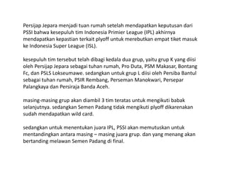 Persijap Jepara menjadi tuan rumah playoff Indonesia Premier League (IPL) yang melibatkan sepuluh tim untuk berebut empat tiket ke Indonesia Super League (ISL). Tim-tim dibagi menjadi dua grup, di mana masing-masing grup akan mengeluarkan tiga tim teratas untuk melanjutkan ke babak selanjutnya, sementara Semen Padang telah mendapatkan wild card. Playoff dimulai pada 16 Oktober 2013 di Stadion Gelora Bumi Kartini.