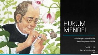 Dokumen tersebut membahas tentang hukum Mendel yang meliputi hukum segregasi dan asortasi. Hukum segregasi menyatakan bahwa pada pembentukan gamet terjadi pemisahan alel secara bebas. Hukum asortasi menyatakan bahwa setiap gen dapat berpasangan secara bebas dengan gen lainnya. Dokumen ini juga menjelaskan tentang persilangan monohibrida, baik yang bersifat dominan penuh maupun intermediat beserta