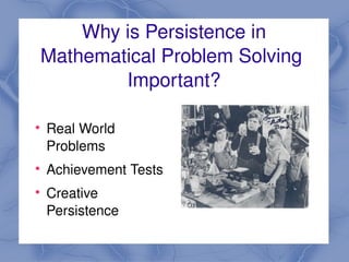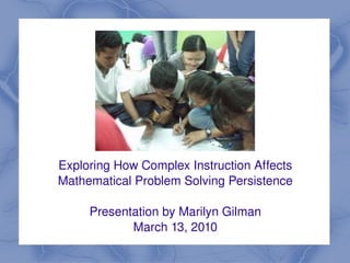 This document summarizes a study exploring how complex instruction affects mathematical problem solving persistence. The study compared two 6th grade math classes, one using complex instruction and one not. It found that students in the complex instruction class showed greater problem solving persistence. They used more strategies on tasks, had more correct solutions, and took more time with difficult problems. Complex instruction fostered richer mathematical discourse, longer work time, and group accountability which benefited problem solving persistence. The findings add support to prior research on complex instruction's positive effects.