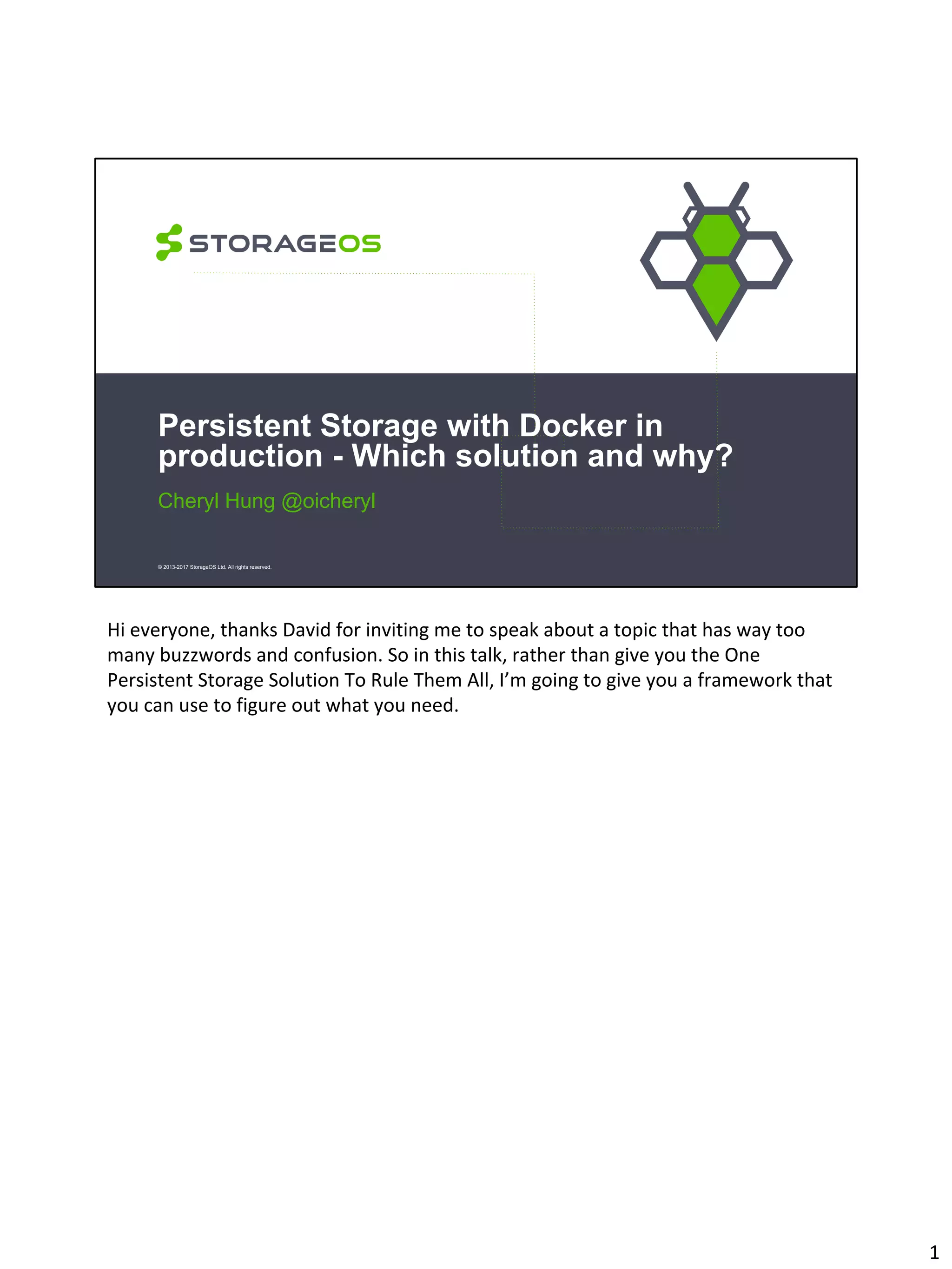 StorageOS is a distributed block storage platform that can be deployed with Docker using volume plugins. It allows the creation of highly available volumes that can be accessed from any node and follow containers during rescheduling. While built with cloud-native principles in mind, some limitations remain such as an assumption of geographic proximity between nodes. Overall, StorageOS scores well at 8 out of 8 on cloud-native storage principles due to its integration with Docker, ability to schedule data optimally, and provision of high availability and portability for application volumes.