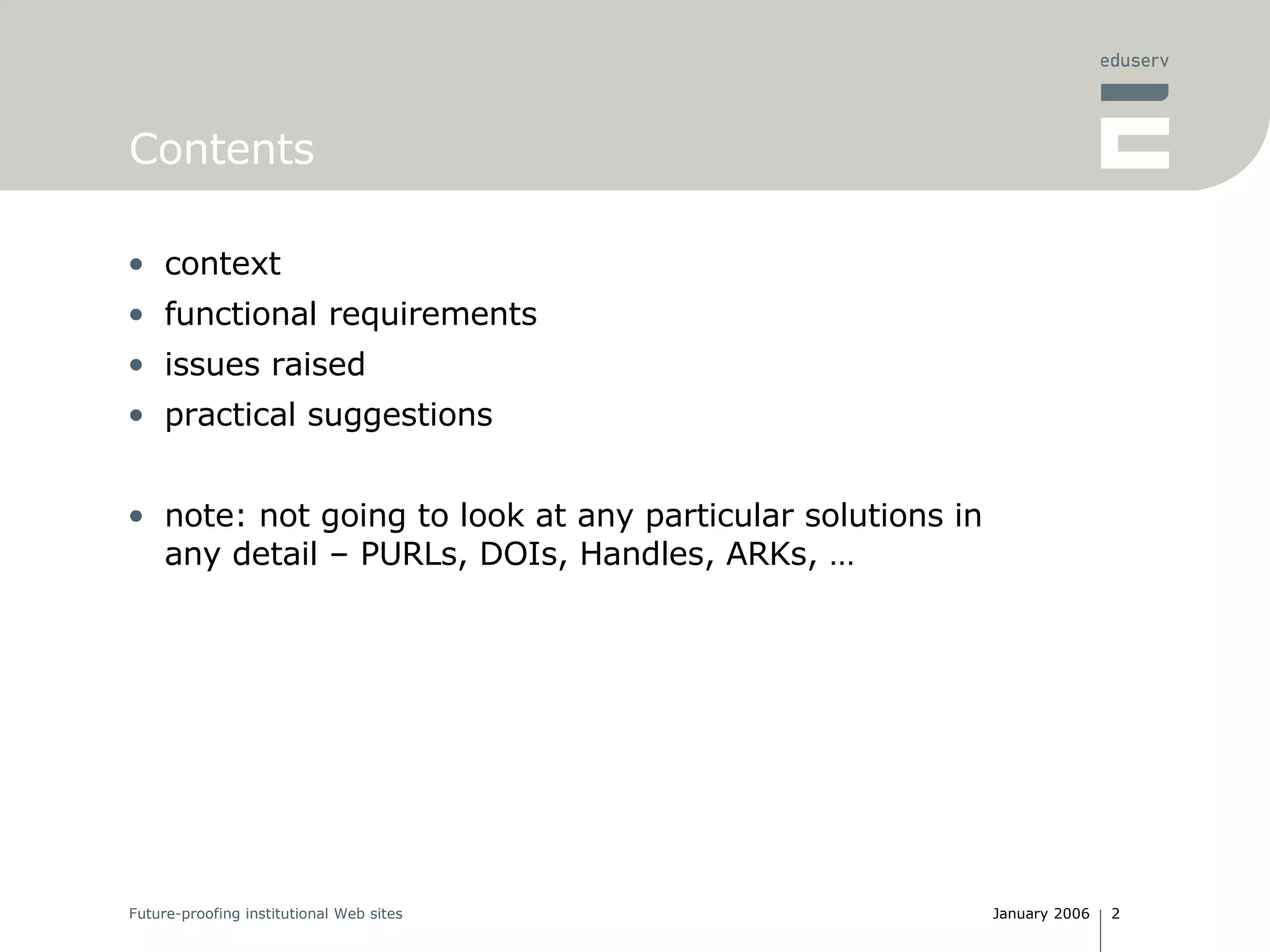 The document discusses the challenges and requirements of creating persistent identifiers for institutional web content, emphasizing the need for identifiers like URIs that remain reliable over time. It highlights the significance of resolution services and avoiding issues related to content accessibility amidst changing technologies and organizational structures. Recommendations include maintaining a commitment to identifier persistence and utilizing standardized systems while avoiding unnecessary complexity in URI structures.