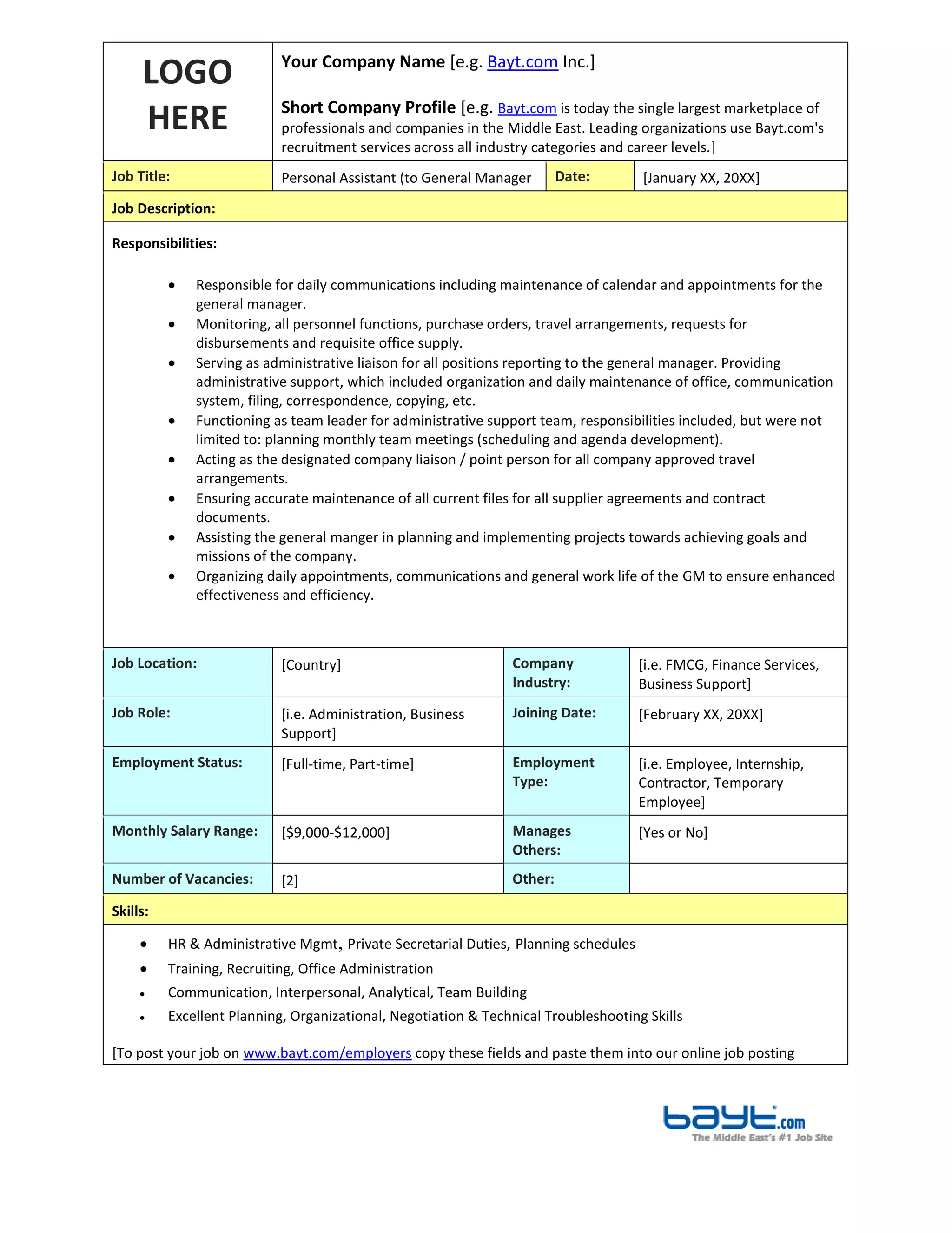 The document outlines a job posting for a Personal Assistant to the General Manager at a company, detailing responsibilities such as managing communications, scheduling, and administrative support. It specifies requirements such as years of experience (7-10 years), skills needed, and the salary range of $9,000-$12,000 per month. Additional information includes application instructions, job location, and employment status.