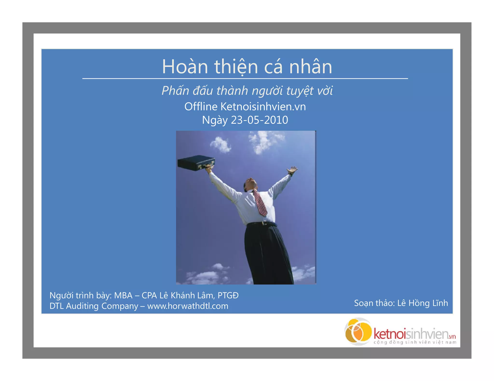 Tài liệu đề cập đến quá trình hoàn thiện cá nhân và các nguyên tắc giúp con người trở thành phiên bản tốt nhất của chính mình. Nó nhấn mạnh tầm quan trọng của các kỹ năng sống và cách quản lý mục tiêu, thời gian, và cảm xúc trong cuộc sống cá nhân và công việc. 10 nguyên tắc chính bao gồm xây dựng nền tảng vững chắc, có trách nhiệm, đầu tư thời gian khôn ngoan, và không ngừng học tập.
