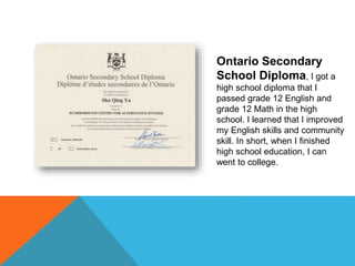 The document discusses the author's educational journey, highlighting their achievement of the Ontario Secondary School Diploma and the development of their English skills. It also reflects on experiences with their advertising company in China, participation in job fairs, and travels to Korea, emphasizing the importance of learning and gaining experience. Additionally, it mentions a presentation on Canadian culture and insights gained from an operation management course that enhanced their management skills.