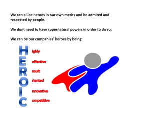 The document discusses the vision of being a highly effective and results-oriented global energy company that is admired for its people, partnerships, and performance. The vision includes safely providing vital energy products, having superior capabilities and commitment, being the partner of choice, and earning admiration through world-class performance and how goals are achieved.