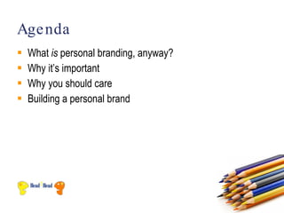 Personal branding involves developing a unique set of attributes that differentiate yourself from others. It tells a story about your skills, experiences and goals to help employers easily understand who you are. In today's dynamic job market where people change careers frequently, having a strong personal brand makes you stand out from the crowd and allows employers to quickly decide that hiring you is the right choice. Developing a personal brand involves taking inventory of your skills, setting goals, crafting an elevator pitch, and continuously learning and networking to evolve your brand over time.