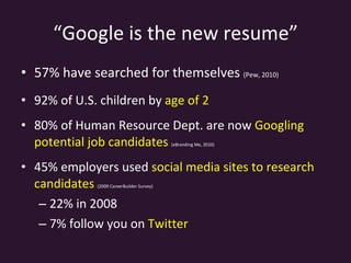 This document discusses the importance of personal branding online. It notes that 57% of people have searched for themselves online and 92% of US children are online by age 2. It recommends establishing an online identity through platforms like LinkedIn, Flickr, and having a consistent name, picture, and personal brand statement. It also discusses monitoring your online presence through tools like Google Alerts and maintaining professionalism online.