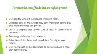 The document provides guidelines for various caregiving tasks including reducing costs of high protein foods, preventing skin breakdown, lifting and moving recipients safely, general positioning principles, turning and positioning rules, ambulation safety, and safe cleaning product use. Key recommendations are to use cheaper poultry over red meat, change recipient positions every two hours to prevent skin issues, bend at hips and knees with back straight when lifting, and do not mix cleaning products.