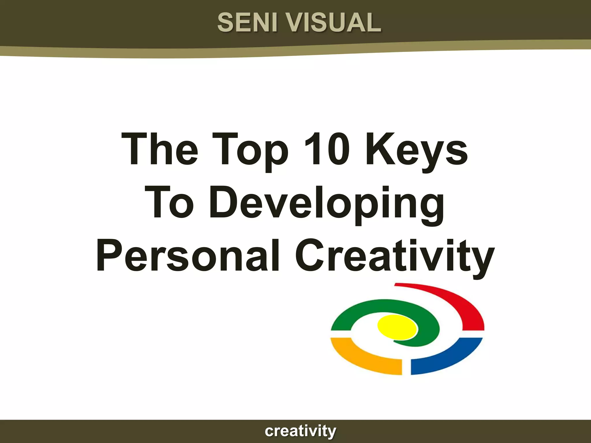 The document outlines the top 10 keys to developing personal creativity. They are: 1) Believe you are creative, 2) Broaden your interests, 3) Prepare to create, 4) Look for or make connections, 5) Break habits, 6) Provide the right environment, 7) Provide time to create, 8) Persevere, 9) Maximize all your senses, and 10) Forget how much you know and adopt a beginner's mindset. The document emphasizes that creativity can be developed through nurturing it with these various techniques and approaches.