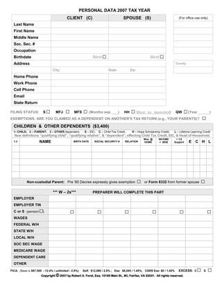 This document contains a personal tax data form for a client for the 2007 tax year. It requests information such as names, addresses, social security numbers, income sources, deductions, and credits. The form is used by a tax preparer to gather necessary information from a client to complete their tax return. It covers many common income types and deductions including W-2 wages, 1099 forms, alimony, rental income, self-employment income, itemized deductions, and various tax credits.