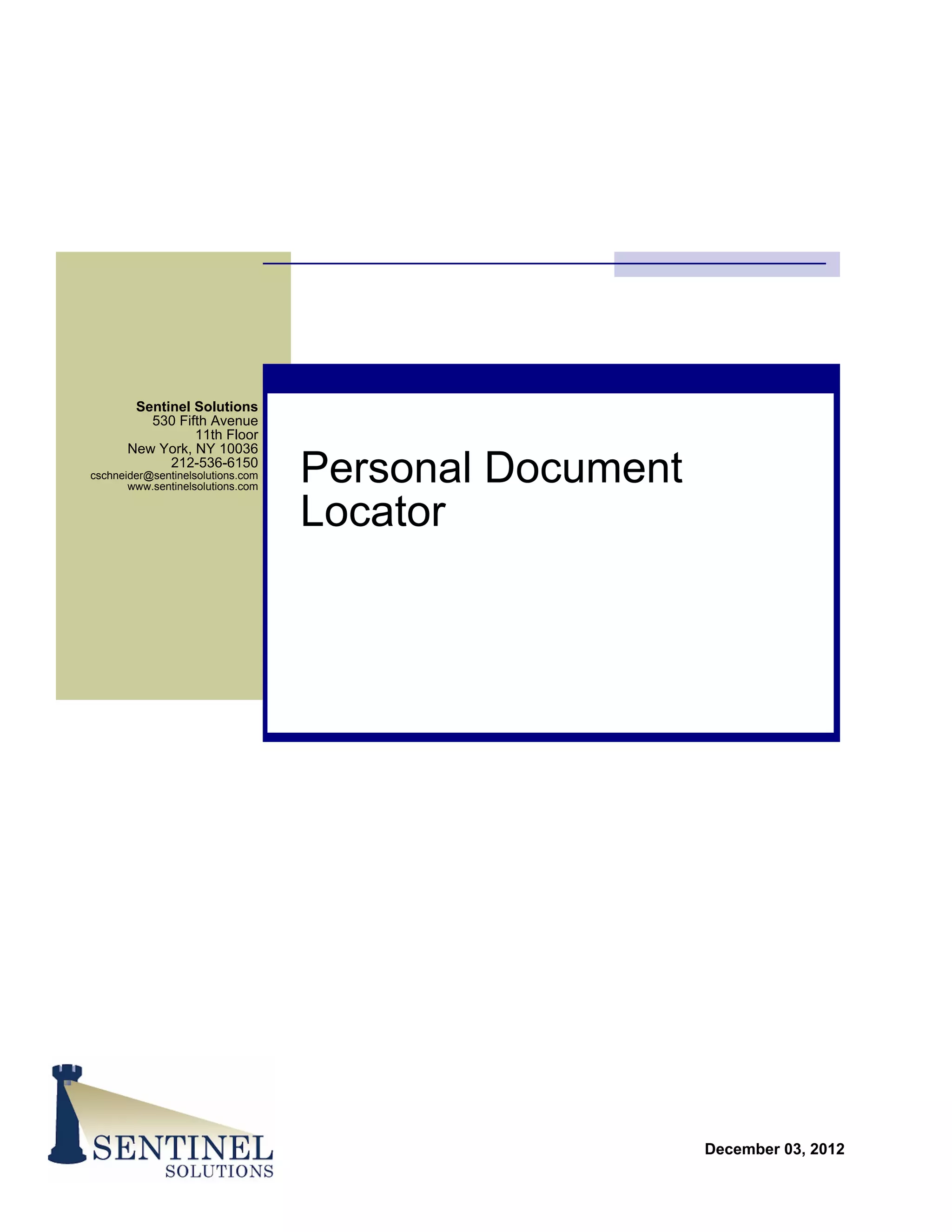 This document is a personal document locator that lists important personal and financial information to assist loved ones in the event of death or disability. It includes sections for personal information, contacts, online accounts, location of documents, and a list of important documents along with their storage locations. The document recommends keeping it in a secure location and updating it at least yearly.