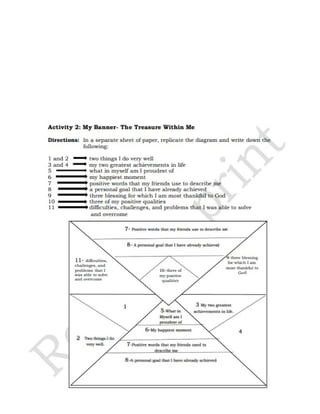 This document focuses on the importance of self-knowledge and personal development, highlighting the journey of understanding oneself through introspection and self-awareness. It discusses concepts like the actual self versus the ideal self, personal effectiveness, and the unique characteristics that define individuals, emphasizing the significance of diversity and acceptance in society. The text also outlines skills for personal growth and strategies to embrace one's uniqueness and navigate life's challenges.