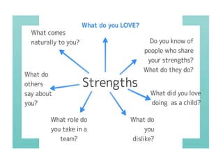 This document discusses personal effectiveness for careers and employability. It defines personal effectiveness as the personal qualities and approach needed to be an effective employee or person. Personal effectiveness skills include independence, initiative, learning ability, stress management, self-confidence, flexibility, time management, and dealing with failures. The document provides resources for identifying strengths, setting goals to improve effectiveness, and support available from the student services career center. It emphasizes playing to strengths, taking goals one step at a time, and finding happiness through engaging in meaningful work.