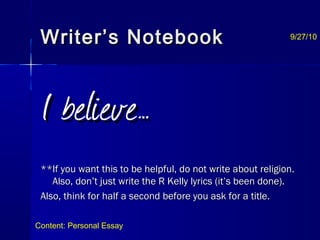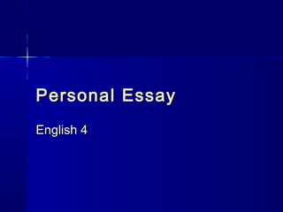 This document provides guidance for writing a personal essay. It discusses focusing on a personal philosophy or insight into life and supporting it with life experiences that taught the philosophy, instances where the writer applied it, and how it will continue affecting their life. Sample essays are analyzed for their thesis, supporting experiences, and explanation of the philosophy. The document also includes topics for a class discussion on censorship and common sayings. Students are tasked with analyzing insights and selecting a topic for their own personal essays.