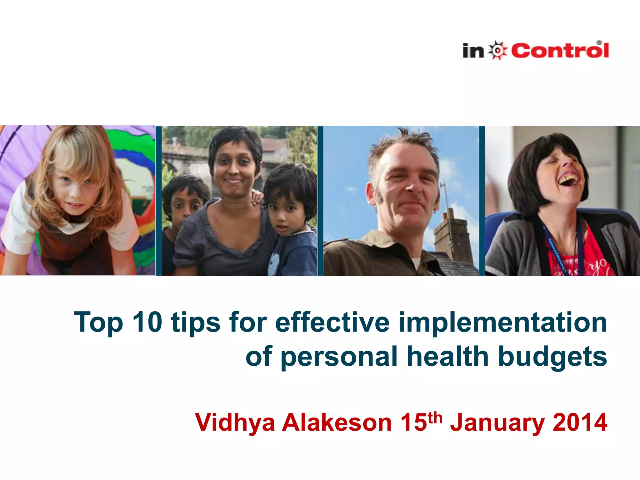The document provides the top 10 tips for effectively implementing personal health budgets. The tips include ensuring flexibility in how budgets can be used and held, providing information locally about how budgets work, allowing people to know their budget amounts upfront, addressing health and well-being beyond just clinical treatment, providing flexibility in choice without restrictive menus, treating individuals as partners respecting their expertise, offering ongoing support for all who need it, keeping the process simple and minimizing bureaucracy, encouraging positive risk-taking with documented risks in care plans, developing the market through coproduction to ensure choice, and conducting regular reviews based on outcomes responding to individual needs.