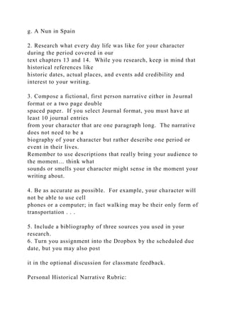 The document outlines an assignment for creating a personal historical narrative, emphasizing first-person storytelling from various historical perspectives during specific periods. Students are instructed to select a character based on historical contexts, conduct research, and write a narrative or journal entries capturing the character's experiences, including a bibliography of sources. A rubric for evaluation is also provided, detailing specific criteria to achieve maximum points.