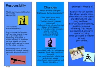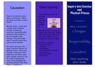 Overtraining means exercising harder than the body is capable of handling. When overtraining occurs, the muscles, bones, heart and lungs are worked too hard and can even be dangerous to one's health. Possible symptoms of overtraining include muscle tension, irritability, decreased appetite, increased aches and pains, and sore muscles. It is our responsibility when exercising to warm up properly to prepare the body and prevent injuries. Not warming up could lead to increased muscle soreness.