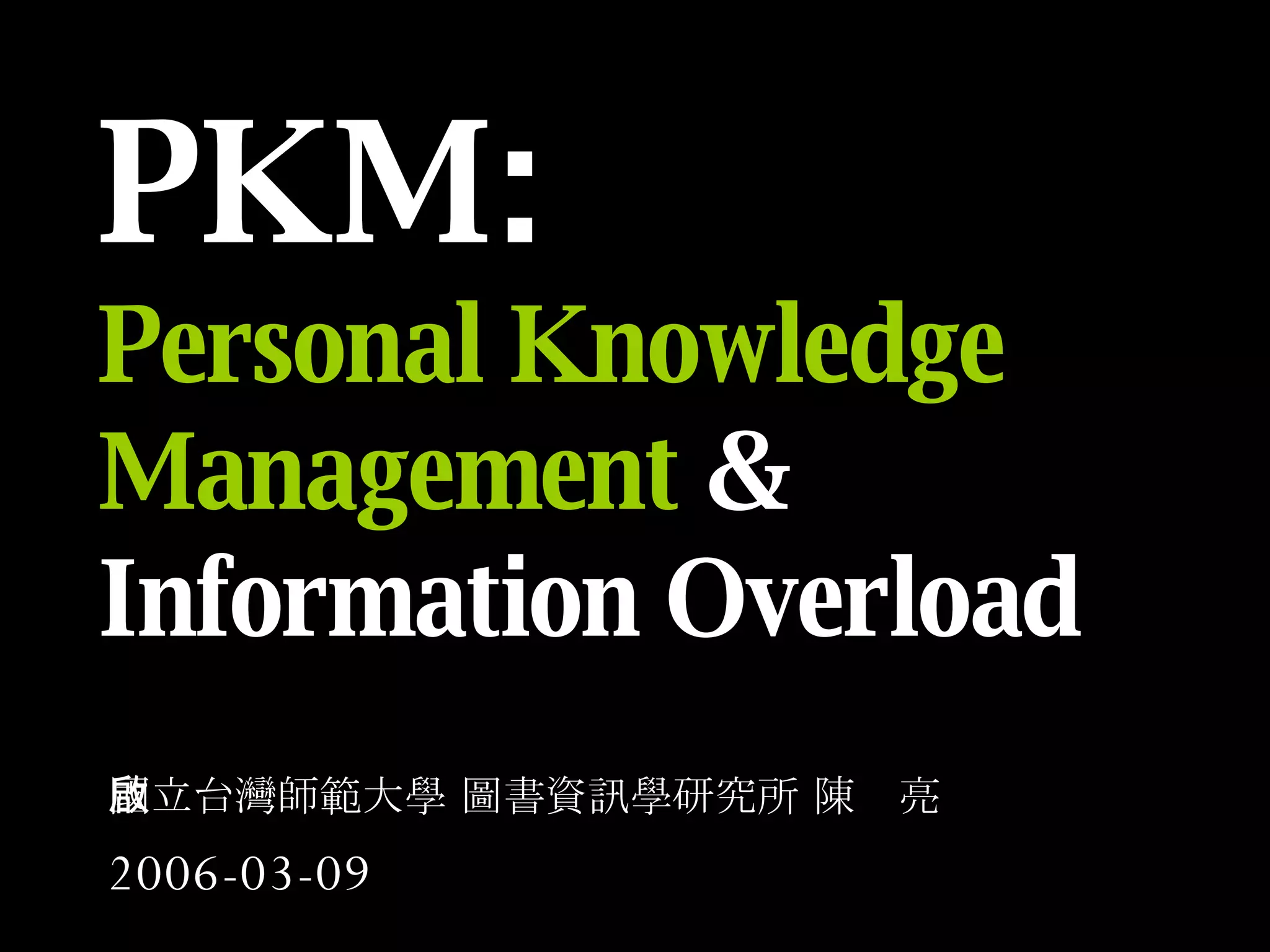 批評 [2]data, information, knowledge, wisdom Frand 認為資訊與知識的區分: begin with data add context to get information add understanding to get knowledge and add judgment (values) to get wisdom Frand 建議的 PKM 策略都只是幫助個人將過量的資訊「再脈絡化」 , 只能說是「個人資訊管理方法」