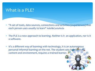 This research aims to study personal learning environments (PLEs) of students in a teacher education program in Spain. It will use a quasi-experimental design with an experimental group that receives training on actively using PLEs and a control group. Data collection instruments will be used at the beginning and end to analyze changes in students' PLEs. The experimental group will participate in workshops introducing PLEs as a new technology-enabled learning approach. The study seeks to determine if this approach improves PLE development and lifelong learning, and to understand how PLEs relate to academic performance and learning styles. Results are pending analysis to understand PLE creation/management processes and the influence of actively using PLEs on academic learning.
