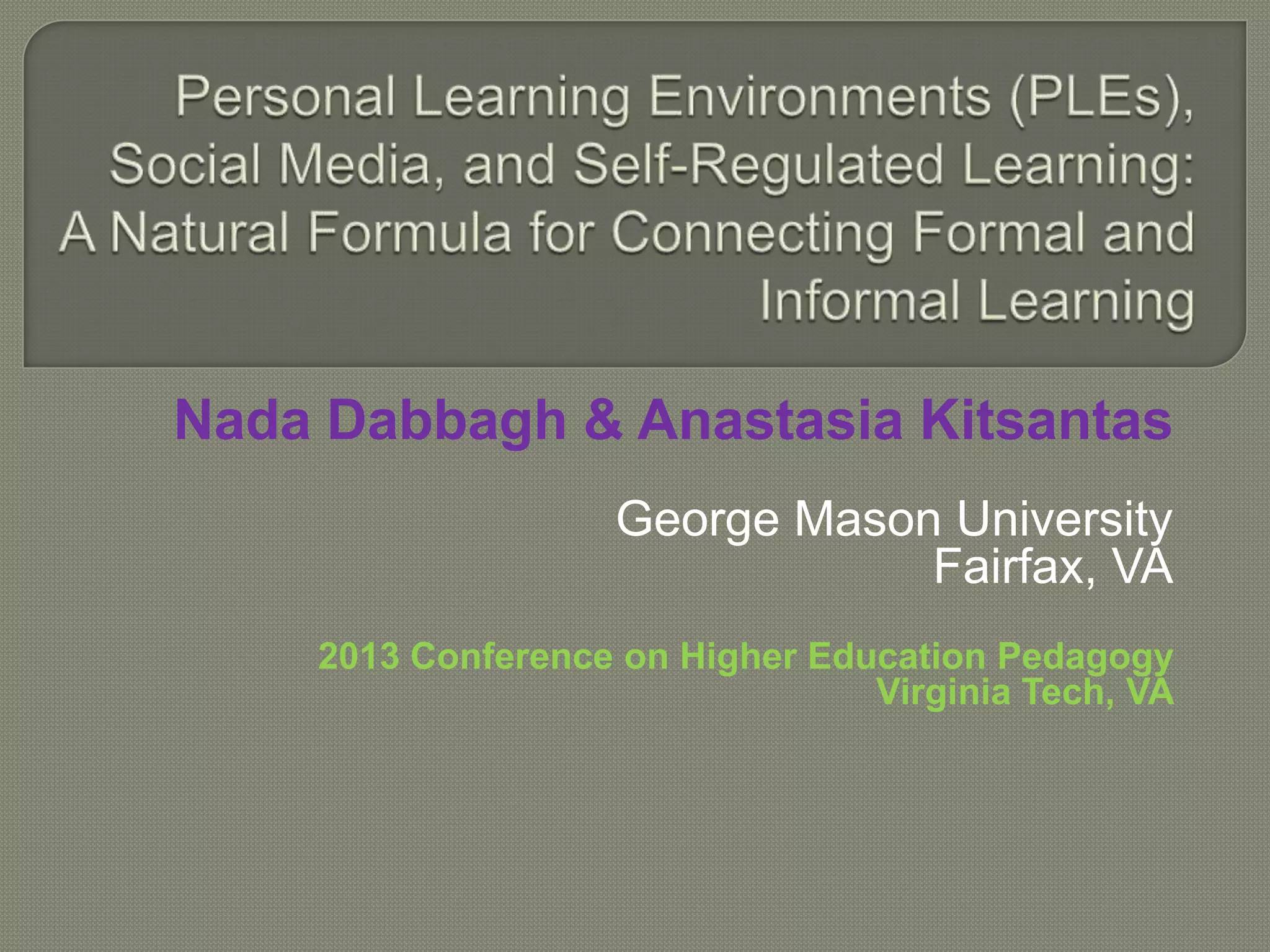 This document discusses the strategic integration of formal and informal learning through personal learning environments (PLEs) and social media. It explores how learning technologies can support self-regulated learning processes. Various web-based pedagogical tools are categorized according to the self-regulated learning processes they support. The document also examines how instructors use these tools to facilitate self-regulation, and how social media can be leveraged to create PLEs that foster self-directed learning.
