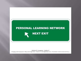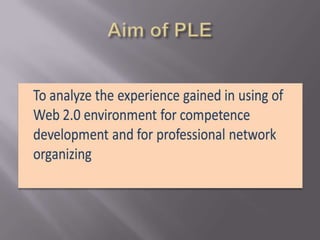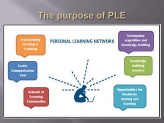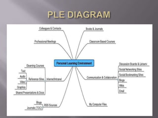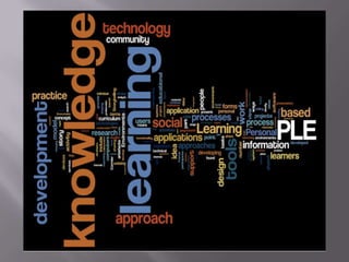 The document discusses personal learning environments (PLEs). It defines PLEs as systems that help learners take control of and manage their own learning by setting goals, managing content and processes, and communicating with others. A PLE consists of a variety of tools and techniques for gathering information, exploring relationships between pieces of information, and is browser-based. It is a concept based on social networks rather than a specific software application. The document contrasts PLEs with the traditional classroom model and emphasizes that PLEs allow learners to direct their own learning from a variety of sources instead of depending on a single institution or system.