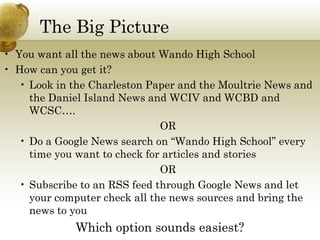 The document provides an overview of RSS feeds and their benefits for receiving information about Wando High School, emphasizing ease of use through various news sources and RSS aggregators. It describes RSS as a tool for free subscriptions that keeps users updated on topics of interest without disclosing personal information. The author encourages setting up an RSS account with Google Reader for managing subscriptions and staying informed on educational developments and community news.