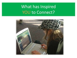 This document discusses how to build a personal learning network (PLN) using digital tools and connections. It recommends starting small by following a few blogs and people on Twitter, and organizing your RSS feeds. Over time, you can become a more active participant by responding to blog posts, sharing links, commenting on others' content, and participating in online communities. The key is to connect with others, contribute your own ideas, and find your purpose in the PLN in order to fully benefit from the connections.