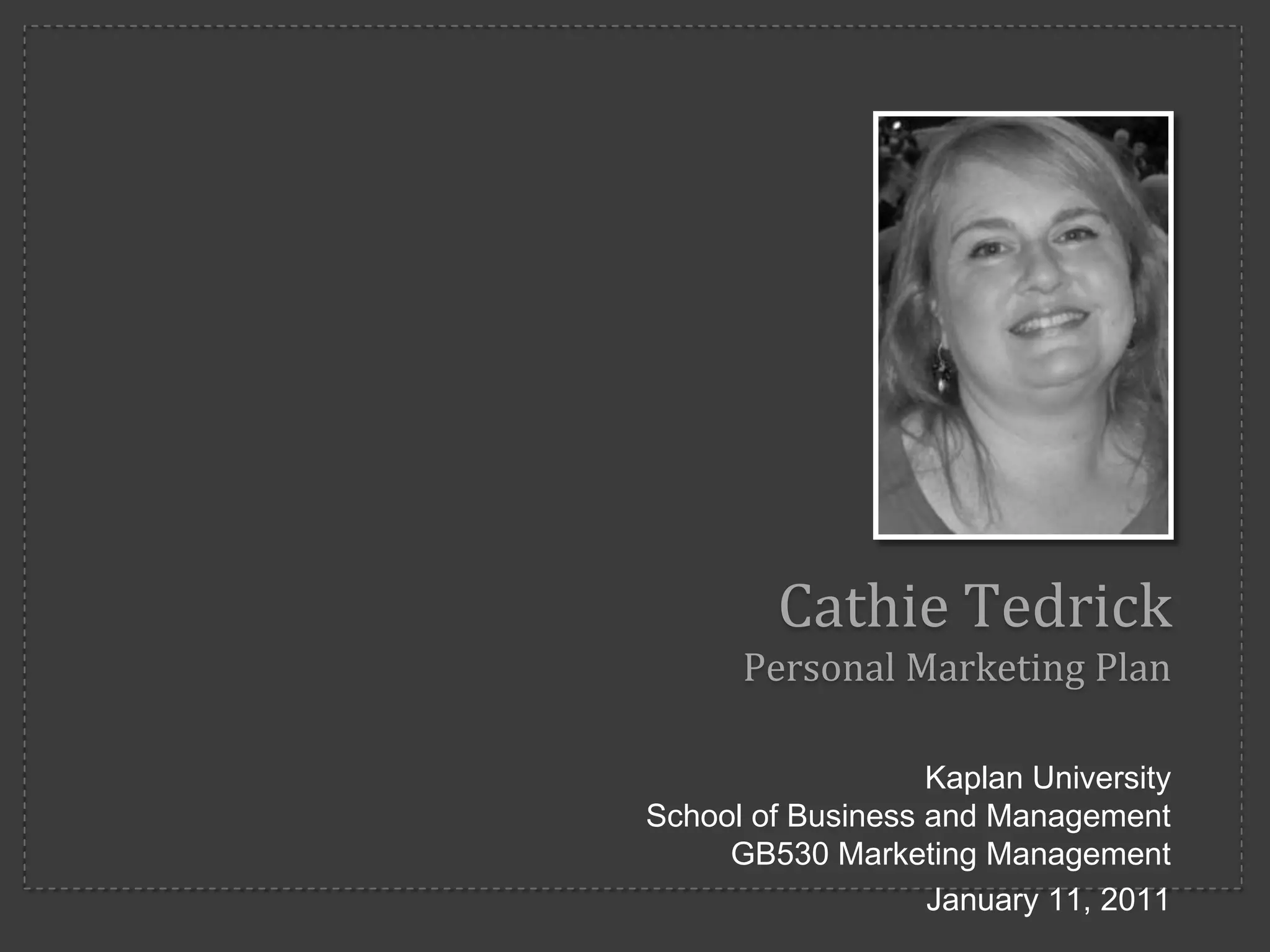 Cathie Tedrick has created a personal marketing plan with the goal of obtaining a marketing or promotions manager position at a Washington state agency within 5 years. Her plan includes a SWOT analysis noting her creative strengths but also her impatience. Her competition has more experience but she emphasizes her 20 years of communications experience. Her positioning statement highlights her extensive experience managing communications programs and clear writing skills. Her marketing mix outlines her skills and portfolio of work samples she will provide as promotions. She plans to complete her MBA in marketing and take on more marketing roles in her current job to implement her plan.