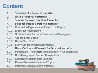 This document provides guidance on how to write a personal narrative. It defines a personal narrative as a personal account that offers details, analysis, and a personal opinion about an event experienced by the writer. It then lists the steps to write a personal narrative, which include choosing an experience, drafting recollections, adding details, revising, and leaving out unnecessary information. The document also discusses introducing the experience, connecting perspectives in the body, and concluding the narrative. It provides examples of narrative topics and writing prompts.
