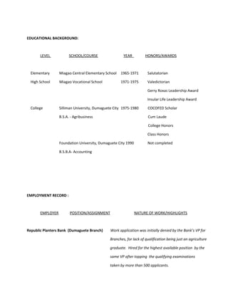 This document provides personal and professional details about Leopoldo F. Moragas. It outlines his educational background, including graduating cum laude from Silliman University. It also details his extensive work experience in banking, having held senior positions at the Philippine National Bank and Republic Planters Bank over 30 years, managing branches and lending operations. Currently he works as a managing consultant for Southern Iloilo Telephone Company and financial consultant for Iloilo Solar Power Plant.