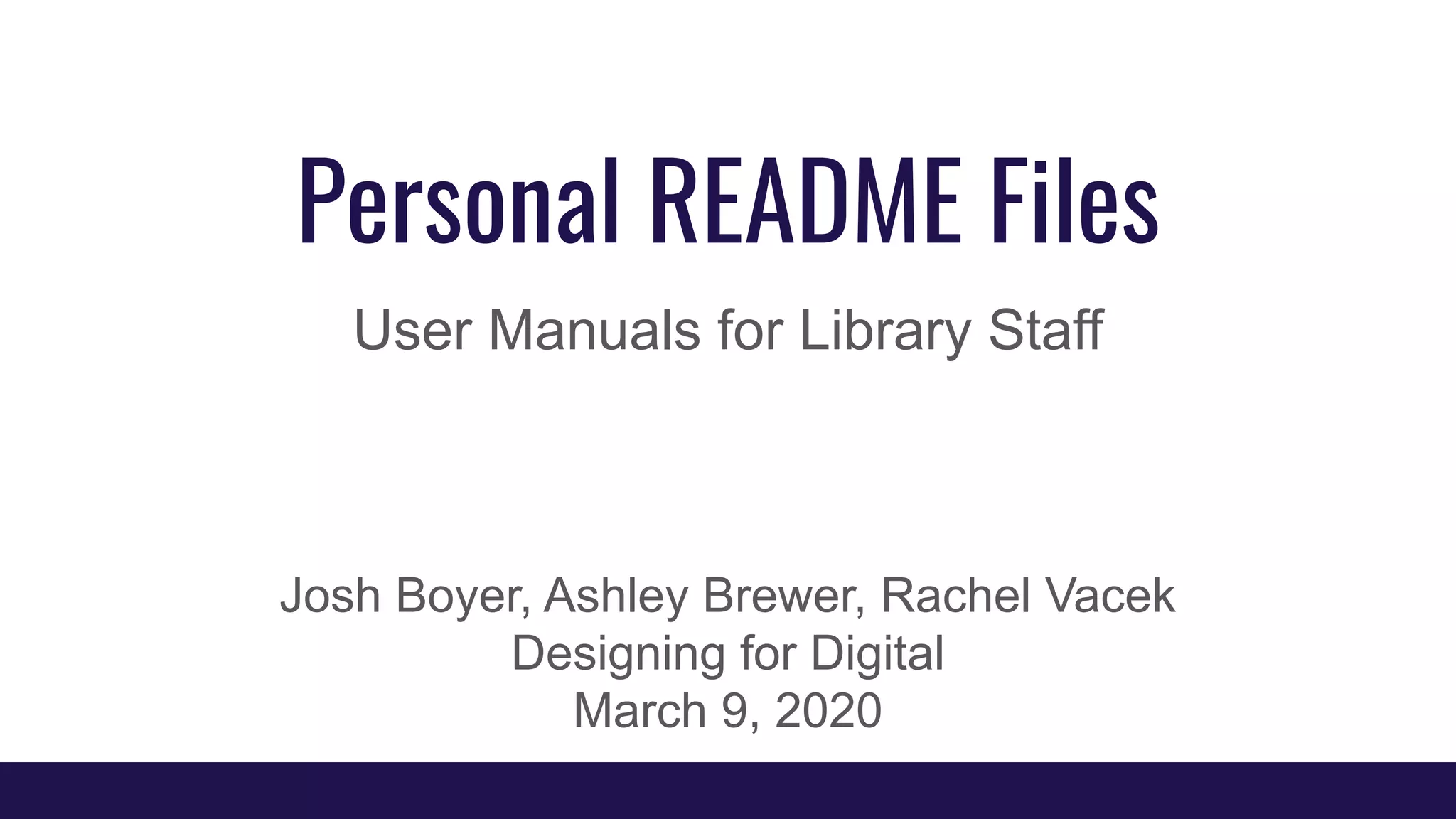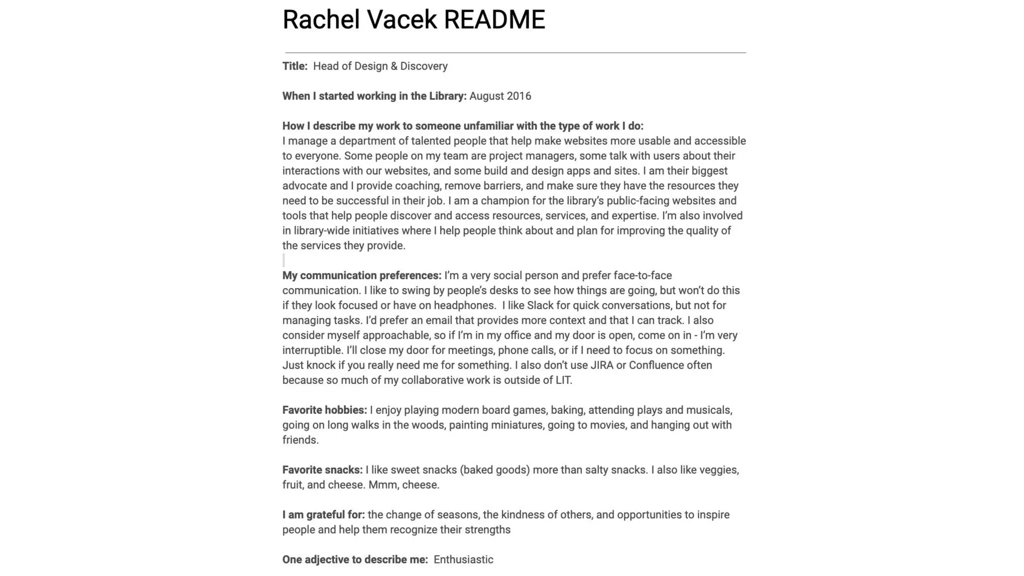 The document discusses the use of personal readme files within library staff teams to enhance communication, onboarding, and relationship management. It contrasts traditional readme files with personal readme files, providing templates from various university libraries and examples of their application. The authors emphasize the benefits these files have brought to team dynamics and individual expression of preferences, expectations, and work styles.