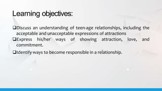 This document discusses personal relationships and responsibilities within relationships. It begins by defining personal relationships as interactions between individuals that help fulfill fundamental needs for survival and belonging. It then explores how attachments are formed from infancy through relationships with caregivers. Key components of relationships like intimacy, commitment, passion and attraction are examined. The document stresses the importance of responsibilities like respecting others, providing support, and being accountable in relationships to make them healthy and long-lasting.