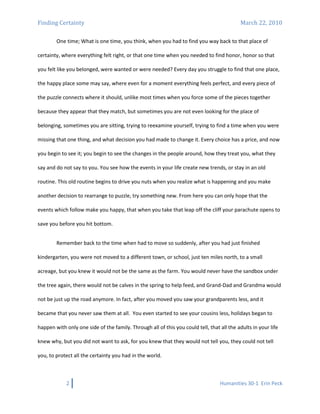 The document discusses finding certainty and belonging during difficult times. It reflects on a time when the narrator had to move as a child and lost the familiar aspects of their life. As a teenager, the narrator discovered ugly truths about the people they looked up to and had to decide whether to follow their path or rise above it. The narrator chose to find their own path to happiness and true comfort, though they still face struggles at times to restore certainty. The document advocates finding ways to redirect focus during hard times, like through hobbies or passions, as a way to regain stability.