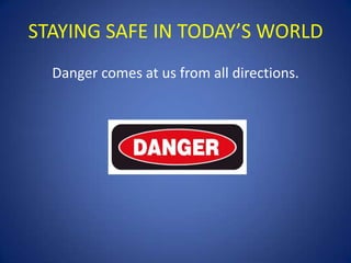 This document provides a comprehensive guide on personal safety, emphasizing the importance of situational awareness to avoid dangerous situations and the need for self-defense strategies. It includes practical tips for staying safe in various environments, such as while walking, driving, and at home, and discusses the legal implications of using self-defense. Individuals are reminded that they are ultimately responsible for their own safety and should be prepared to engage in self-defense if necessary.
