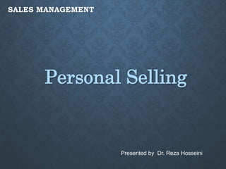 The document discusses personal selling and sales force management. Personal selling involves face-to-face and other interpersonal communication methods and aims to effectively relate the company to customers to increase profits and customer satisfaction. Sales force management involves planning, organizing, leading, and controlling sales force activities, including shaping the geographical, product-based, and customer-focused structures of the sales force. Each structure type defines responsibilities to improve product knowledge, manage conflicts, and enhance customer relationships.