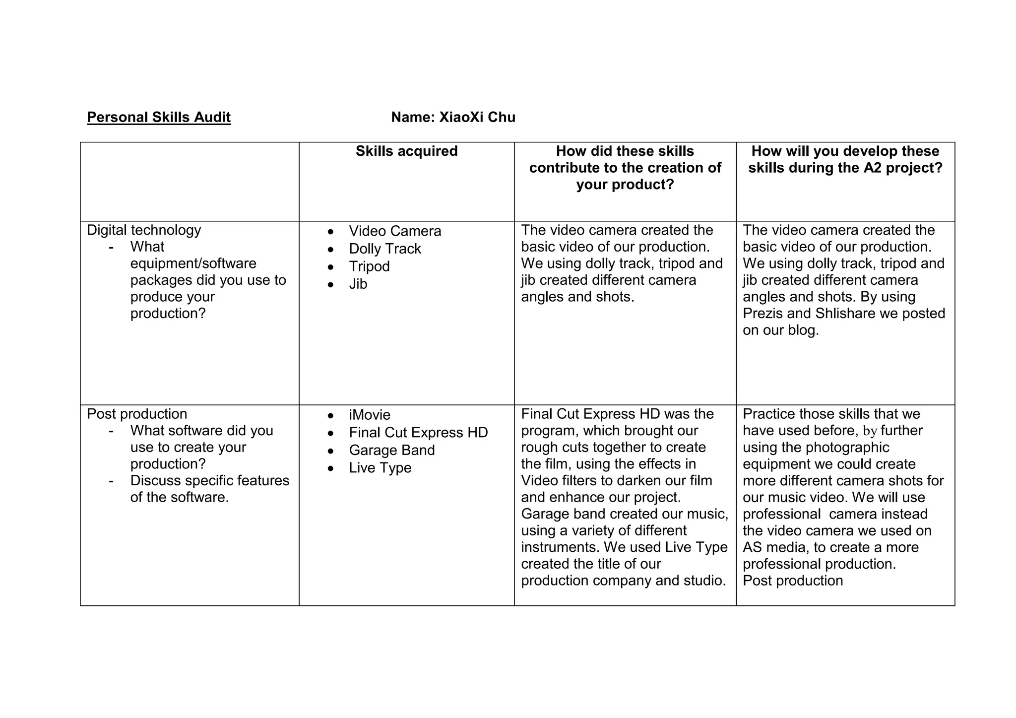 This document outlines XiaoXi Chu's personal skills audit for an A2 media project. It lists the digital technology, post-production software, and research/planning tasks used to create their prior media product. For the A2 project, XiaoXi plans to further develop their skills in using professional camera equipment, expanding research scope, and improving planning/communication with their partner to create a more creative and unique music video.