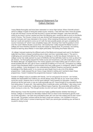 Callum has been interested in media since high school. He took an animal care course in college to improve his grades to enroll in the media course. He enjoyed exploring different areas of media in college such as editing and radio. Callum favors the motion graphics and video editing side of media and hopes to find a job that includes some editing. He developed skills in communication and confidence through the media course. Callum is motivated to learn more about media at university and give his education 100% effort.