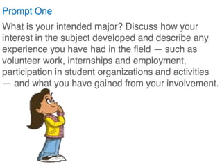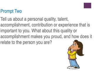 This document provides an agenda and guidance for writing personal statements for college application essays. It discusses choosing options and goals, and how universities use the statements. The purpose is to provide clarity, depth, and context beyond other application materials. Students are advised to brainstorm qualities, experiences, and accomplishments before drafting their essays in response to prompts about intended major, personal qualities, and reasons for transferring schools. The document cautions against common mistakes and introduces faculty leading a workshop on revising statements.