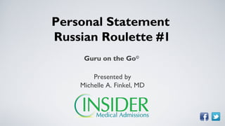 The document is a presentation by Michelle A. Finkel, MD and founder of Insider Medical Admissions, responding to a question about using a "wacky perspective" in a personal statement. Dr. Finkel cautions that medical schools only give applicants one chance to make an impression, so an unconventional personal statement could hurt one's application. She recommends focusing the personal statement on sharing relevant experiences and qualities instead of trying to stand out in a risky way.